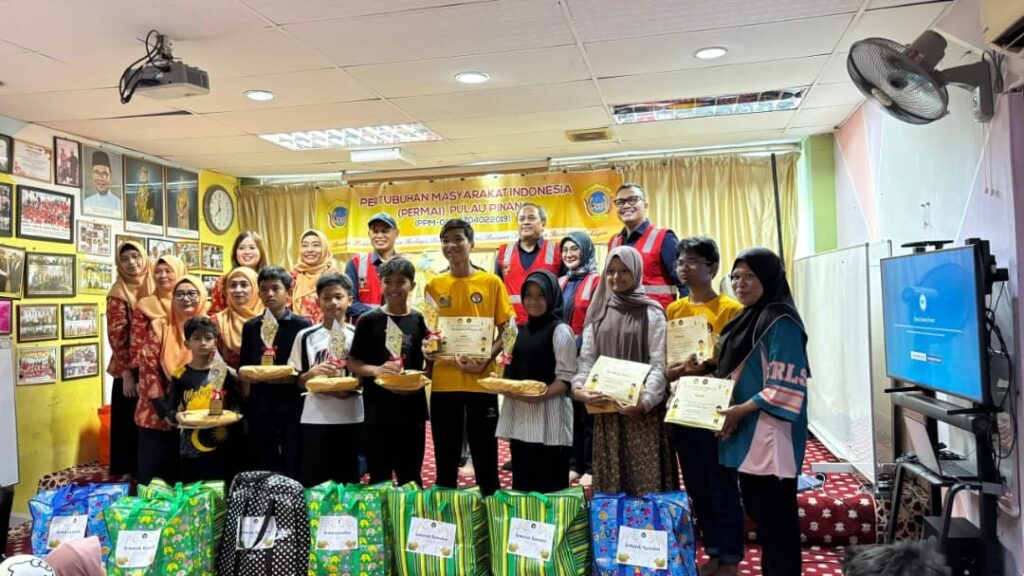 Pulau Pinang, Malaysia — Semarak bulan suci Ramadhan membawa kehangatan tersendiri bagi anak-anak Pekerja Migran Indonesia (PMI) di Pulau Pinang. Pada hari Kamis, 12 Maret 2026, Sanggar Bimbingan PERMAI Penang mendapat kehormatan istimewa dengan hadirnya Konsul Jenderal (Konjen) Republik Indonesia di Penang, Bapak Wanton Saragih, beserta Ibu Sintha Wanton selaku Ketua Dharma Wanita Persatuan (DWP) KJRI Penang. Kunjungan silaturahmi ini disambut dengan antusias oleh anak-anak dan pengurus sanggar, sebagaimana terlihat dari layar penyambutan khusus yang disiapkan di ruang belajar utama. Agenda utama dalam anjangsana ini adalah penyerahan apresiasi dan hadiah bagi para pemenang “Lomba Semarak Ramadhan” yang telah diikuti oleh siswa-siswi Sanggar Bimbingan PERMAI. Senyum semringah dan keceriaan memancar dari wajah anak-anak saat mereka memegang piala, sertifikat penghargaan, serta berbagai bingkisan hadiah. Tidak hanya mengapresiasi prestasi anak-anak, rombongan DWP dan staf KJRI yang tampil kompak juga mendistribusikan bantuan paket takjil untuk berbuka puasa serta donasi pakaian bagi anak-anak sanggar. Bantuan dan hadiah tersebut diterima dengan penuh rasa syukur oleh pengurus Sanggar Bimbingan PERMAI Penang, Bapak Agung Kartajaya, yang turut didampingi oleh para pengajar yang selama ini berdedikasi mendampingi proses belajar mengajar anak-anak di sanggar. Turut mendampingi Bapak Konjen RI dalam lawatan ini antara lain Bapak Safaat Ghofur (Penerangan Sosial Budaya / Pensosbud I KJRI Penang), Bapak Lukito, serta jajaran staf dari Konsulat Jenderal Republik Indonesia di Penang. Kegiatan yang dibalut dalam suasana kekeluargaan khas Ramadhan ini merupakan wujud nyata kepedulian dan kehadiran perwakilan negara bersama organisasi Dharma Wanita Persatuan terhadap anak-anak WNI di tanah perantauan. Diharapkan, apresiasi dan tali asih di bulan suci ini dapat melipatgandakan motivasi anak-anak untuk terus semangat belajar dan berprestasi, sekaligus menanamkan nilai-nilai kebersamaan dan kepedulian sosial yang kuat sejak dini.